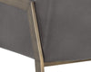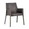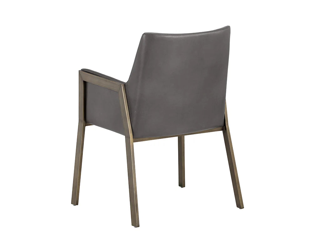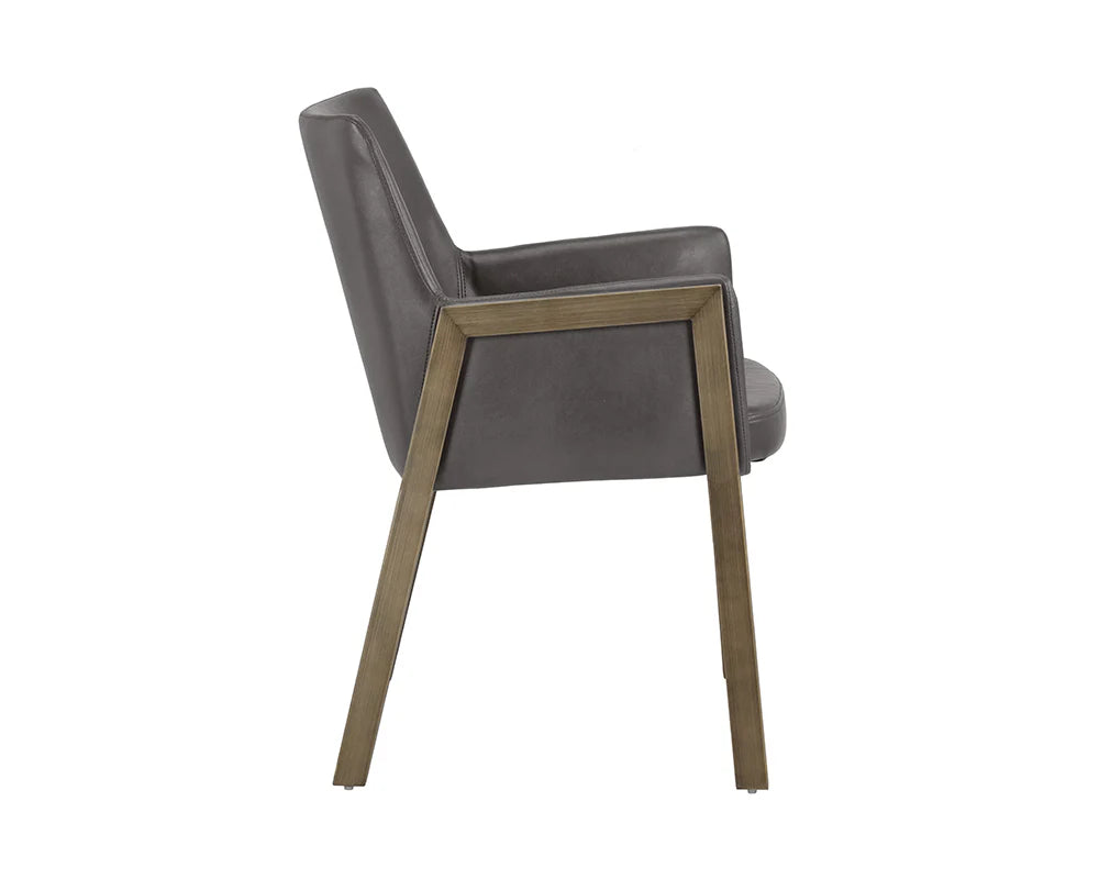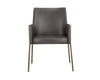 The Bernadette Dining Armchair features a shapely design with an exposed brushed antique brass frame. Upholstered in faux leather for added style and durability.