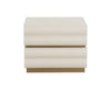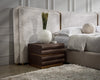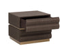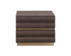 The Subira Nightstand brings sculptural detail to the bedroom with its tiered drawer fronts, crafted from rubberwood and wrapped in chocolate raffia for a textured finish. Resting on a golden stainless steel base, the design is elevated by a subtle metallic sheen. Its two spacious drawers open to reveal velvet-lined interiors, combining practicality with a tactile finish.